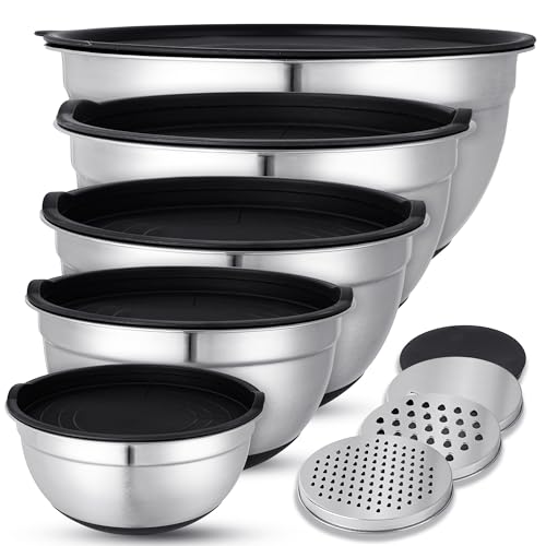 Homikit blandningsskål, 5 stycken svart rostfritt stål skål salladsskål set med lock för kök, stapelbar, mångsidighet, diskmaskinssäker, 4,5 l/2,7 l/1,5 l/1,2 l/0,7 l