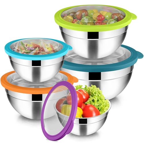 Joyfair blandningsskål set om 5, skål i rostfritt stål med transparent lufttätt lock, 4,5 l/2,7 l/1,5 l/1,2 l/0,7 l, stapelbar salladsskål för servering/matlagning/bakning, diskmaskinssäker – färgglad