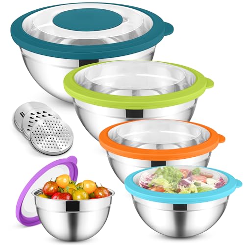 HaWare blandningsskål set om 5, rostfritt stål skål salladsskål set med transparent lufttätt lock & 3 rivtillbehör för matlagning bakning, 4,5 l/2,8 l/1,5 l/1,2 l/0,7 L, diskmaskin, färgglada