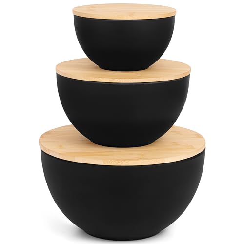Winter Shore Stor Salladsskål med Lock (3-Pack) - Livsmedelssäkra Plastserveringsskålar med Bambulock för Popcorn, Chips, Festmat - Små, Medelstora & Stora Storlekar med Skärbrädeslock av Bambuträ