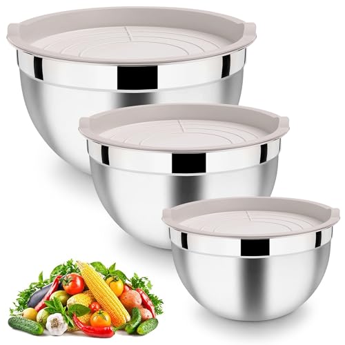 HaWare blandningsskål, rostfritt stål skål salladsskål set om 3 med lufttätt lock, perfekt för bakning/matlagning/tillredning, stapelbar & diskmaskinssäker, 4,5 l/2,7 l/1,5 l – khaki