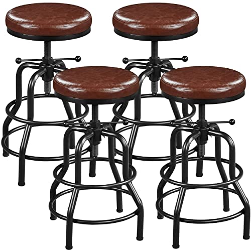 Yaheetech Barstolar med 4 stycken vintage barstolar, höjdjusterbar skruvpall 54,5 71,5 cm barstol med tjock kudde som kan belastas upp till 136 kg, diskhöjd för matsal/kök/bar/salong/café, brun