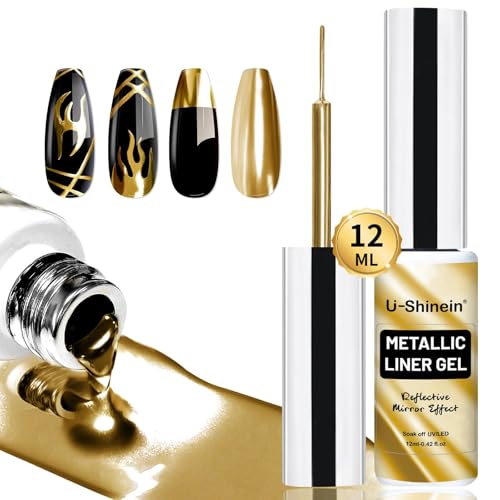 U--Shinein metallisk målning gel, 3D spegel effekt nagellack, ritgel med integrerad tunn pensel, blötläggning för salong och gör-det-själv-manikyr, guld
