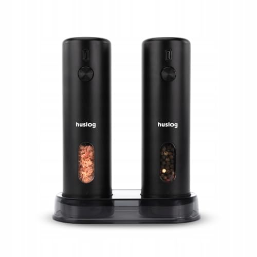 Huslog Elektrisk salt- och pepparkvarn, set med 2, USB-C-uppladdningsbar med LED, stativ och rengöringsborste – Kryddkvarn för salt, peppar, chili, örter (110 ml)