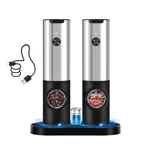 Elektriskt salt och pepparkvarn-set uppladdningsbar, USB-laddningsstation, automatisk peppar och saltkvarn kryddkvarn påfyllningsbar, enhandsmanövrering, justerbar grovhet, LED-ljus