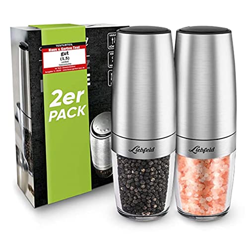 Liebfeld Elektrisk salt- och pepparkvarn (set om 2) – peppar och saltkvarn med vippsensor – elektrisk kryddkvarn av rostfritt stål med keramisk kvarn – salt och pepparströare