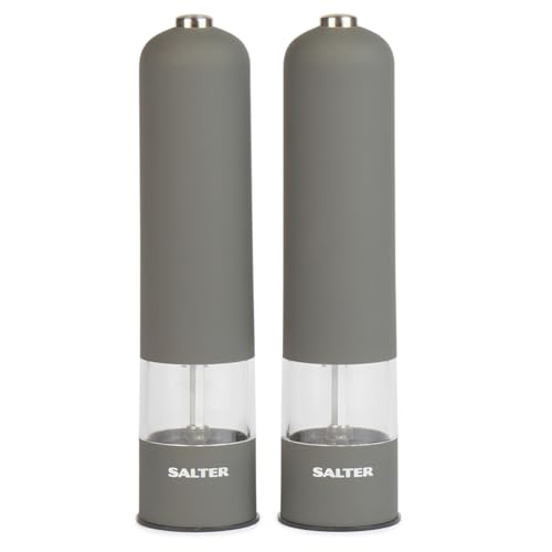 Salter BW12199EU7 Cosmos elektroniskt salt- och pepparset – kryddkvarnar, en drift, keramisk malningsmekanism, upplyst bas, artrithänder, BPA-fri akrylkropp, batteridriven, grå