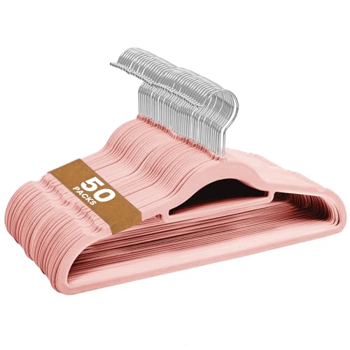 Sasha Morel 50-pack klädhängare i sammet – halkfria sammetshängare för kläder, platsbesparande vuxenhängare med slipsorganisering och vridbara krokar – klädhängare garderobsförvaring – rosa