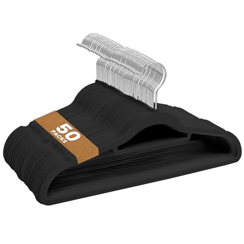 Sasha Morel 50-pack klädhängare i sammet – halkfria sammetshängare för kläder, platsbesparande vuxenhängare med slipsorganisering och vridbara krokar – klädhängare garderobsförvaring – svart