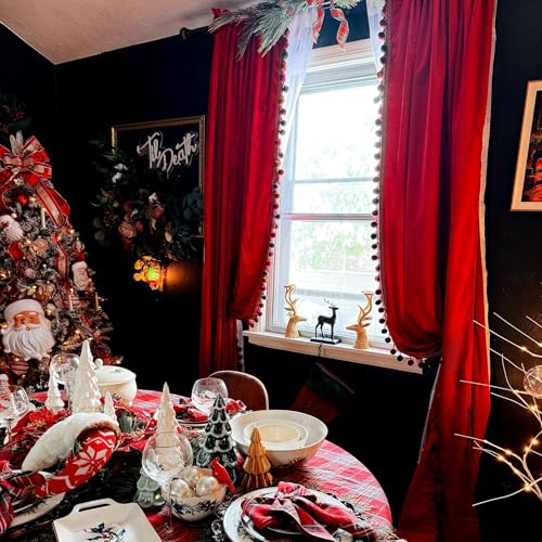 StangH Julröda pom-pom sammetsgardiner – lyxiga värmeisolerade fönstergardiner för sovrum vardagsrum, ljusblockerande integritetsdraperier för teater, B 132 x L 213, 2 paneler och bindningar