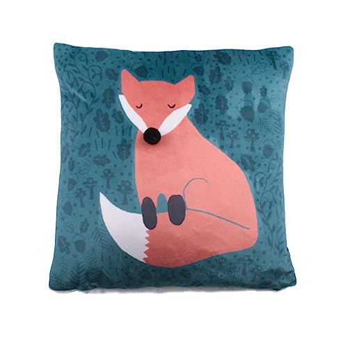Fusion – Blågrön Rävkudde (43 x 43 cm) – Blågrön sammetskudde/vit fleece 1 sida – fyllning ingår – blått djurtryck kudde med överdrag ingår/kuddinlägg – skogsdjurkudde