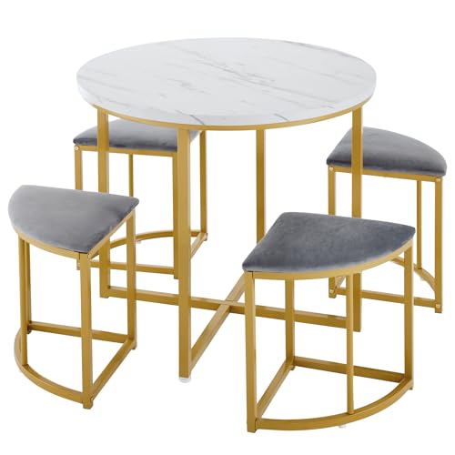 I0I&I0I Matgrupp med 4 stolar, matbord set rund vit, MDF-bordsskiva, guldpläterad järnram, sammetsstolar, modern design, utrymmesbesparande, bekväm, perfekt för små rum (stil 2)
