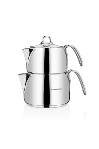 Korkmaz A029 Perla turkisk tekanna set för spishäll, 18/10 rostfritt stål dubbel tebryggare med värmebeständiga handtag, Samovar-stil tekanna och tekanna med 1 800 ml (1 800 ml) och 3 200 ml (1 oz)