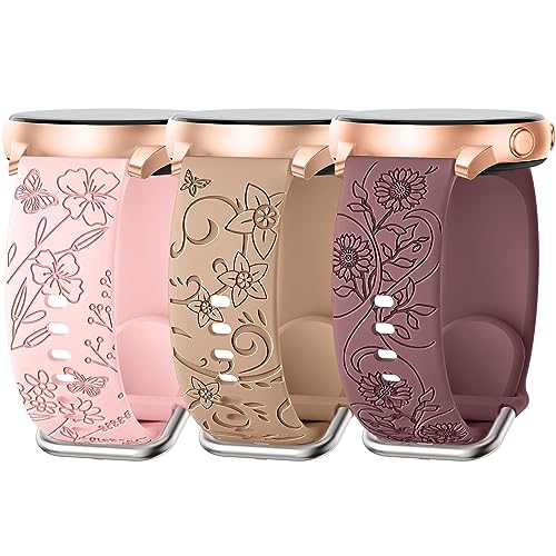 AMSKY 3-delat Armband med Gravyr och Blommönster, Kompatibel med Samsung Galaxy Watch 7/6/5/4 40mm 44mm, Watch 6/4 Classic 43mm 47mm 42mm 46mm, 5 Pro 45mm, 3 41mm, 20mm Silikonarmband för Kvinnor
