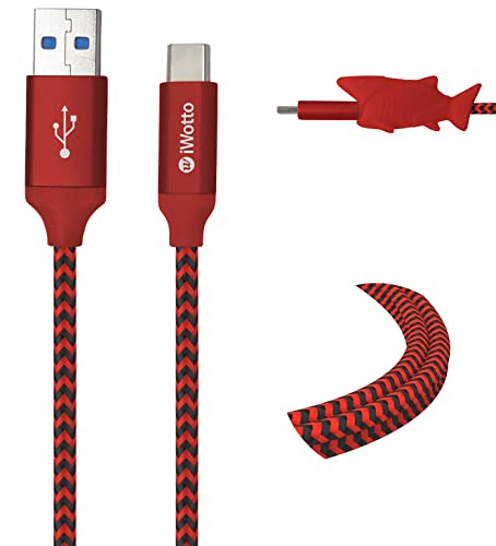 Iwotto USB Type C Cable 1M - Snabb laddning och synkning för mobiler - USB 3.0 Red - Hållbart nylon och Shark Cable Protector ingår - Kompatibel med Samsung, Xiaomi, Huawei, PS4, Xbox