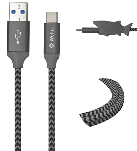 Iwotto USB Type C Cable 1M - Snabb laddning och synkning för mobiler - USB 3.0 Grey - Hållbart nylon och Shark Cable Protector ingår - Kompatibel med Samsung, Xiaomi, Huawei, PS4, Xbox