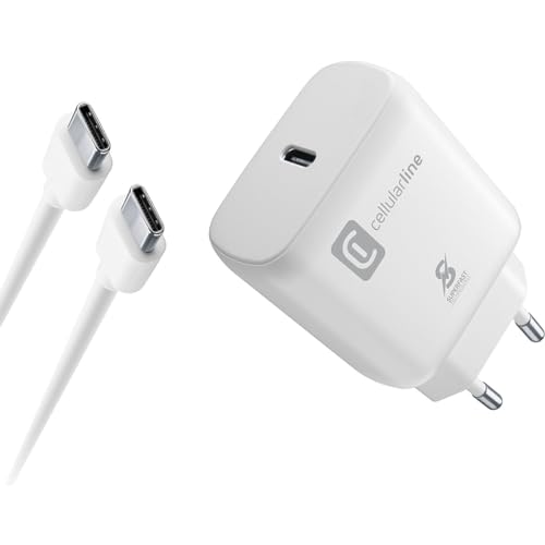 Cellularline – Super Fast Charger Kit 25 W – nätladdare för kompatibla Samsung-enheter med 25 W Super Fast Charge Power Delivery – 1 m lång USB C till USB-C-kabel ingår – vit