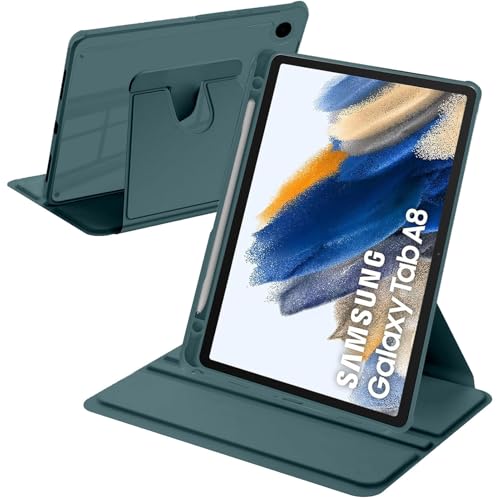 A-BEAUTY Roterande Fodral Kompatibelt med Samsung Galaxy Tab A8 10.5 Tum (SM-X200/X205/X207) med S Pennhållare, Stöttåligt Fodral Klar Rygg, Automatisk Väckning/Sömn, Mörkgrön