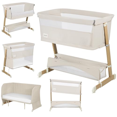 LIONELO Thomi Plus 5-i-1 Spjälsäng för Baby (0–4 år), Co-Sleeper, Fristående Säng, Lekhage, Juniorsäng, Barnsoffa, Justerbar Höjd, Madrass T25, Meshsidor, 2 Hjul, Beige Sand