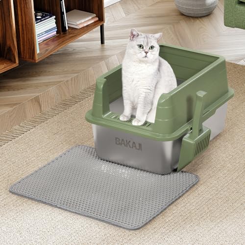 BAKAJI XL Öppen kattsandsbricka med stålbas med anti-sandpåse, skopa för samling, anti-smutsmatta, halkfri bas, kapacitet 25 liter, grön, 50 x 35 x 30 cm