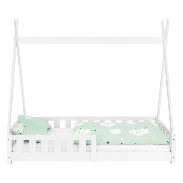 ML-Design Barnsäng Tipi 80x160 cm vit med fallskydd och lamellram, tillverkad av furu, indisk säng av massivt trä för flickor och pojkar, hus säng med staket barnhus ungdomssäng leksäng tält