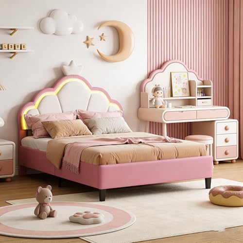 Flicksäng, 140 x 200 cm, barnsäng med ribbotten och LED-belysning, prinsessäng för flickor, säng med justerbar, molnformad, stoppad huvudgavel och krondekoration, rosa