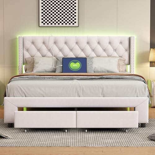 YYXLDYNB Dubbel vadderad säng, 160 x 200 cm, dubbel sängram med LED-belysning, säng för 2 personer med 4 förvaringslådor, LED-belysning, ribbotten, utan madrass, beige