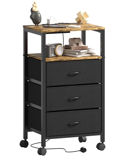 Lutown-Teen sängbord med laddningsfunktion, 3 lådor, sidobord med hjul, sängskåp med 2 AC-uttag och 2 USB-portar för vardagsrum, sovrum, vintagebrunt