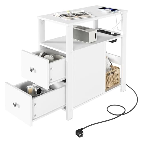 WOLTU Smalt soffbord med laddningsstation för soffa, sängbord med 2 lådor 2 hyllor 1 fack, för vardagsrum, sovrum, 60 x 60 x 30 cm, vit