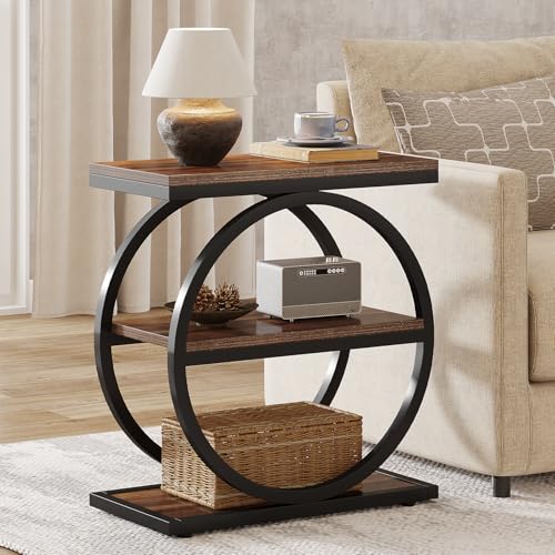 Tribesigns Soffbord, smalt soffbord med 3 förvaringshyllor, sidobord i trä med svarta metallramar, industriellt litet soffbord för vardagsrum, smalt nattduksbord och sängbord för sovrum