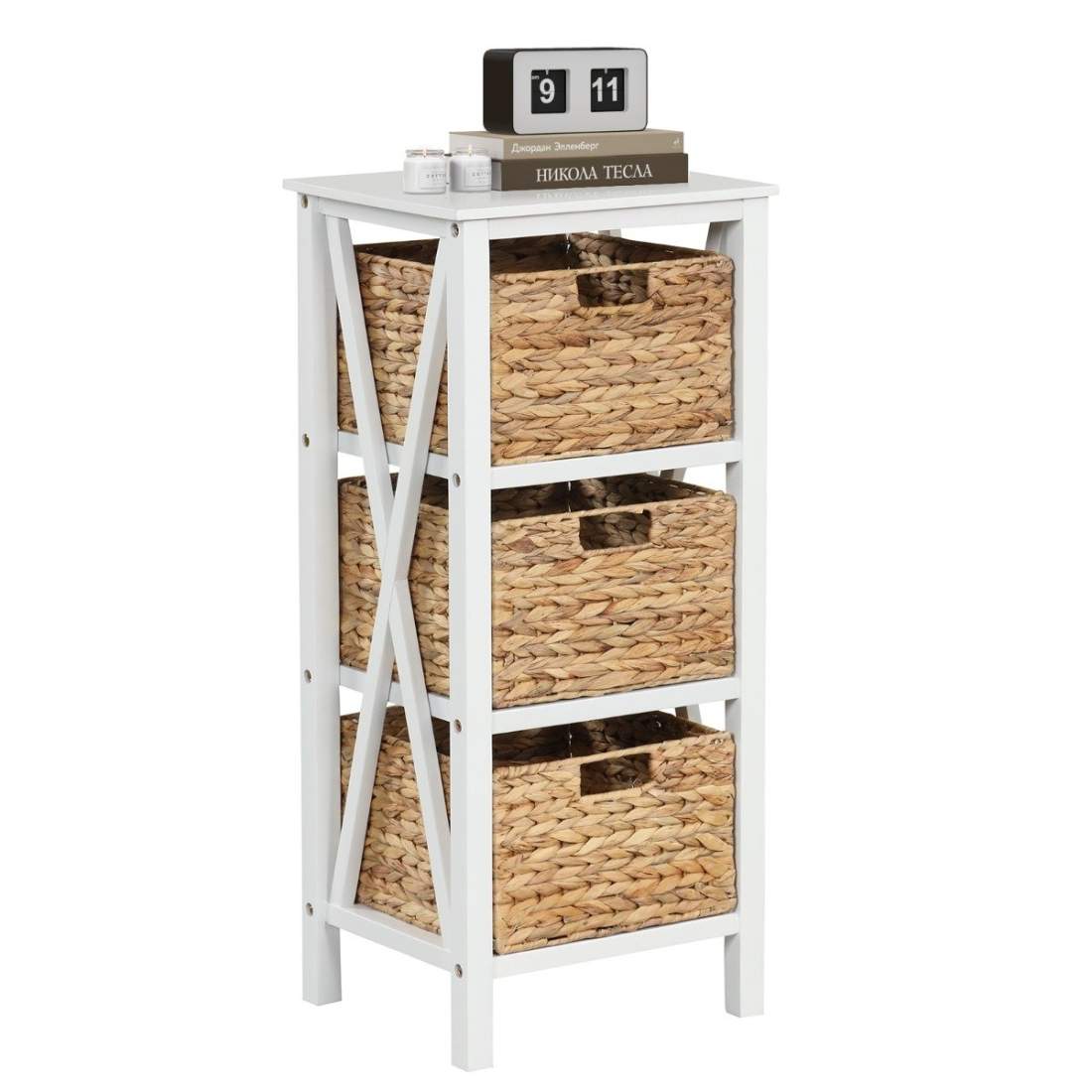 3-vånings sängbord med 2 sjögräskorgar & X-Design smalt sidobord 36 x 30 x 57 cm vit