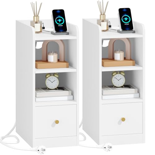 Hzuaneri Sängbord med laddningsstation, USB- och typ C-port, smalt gavelbord med 3 nivåer förvaringsutrymme och 1 låda, nattduksbord för sovrum, vardagsrum, hemmakontor (Vit, 2er Set)