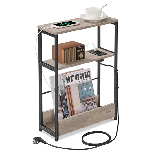 VASAGLE smalt sidobord, sängbord med laddningsfunktion, litet soffbord, 3 hyllor, tidningshållare, för vardagsrum, sovrum, arbetsrum, greige melerad-bläck svart LET335K05
