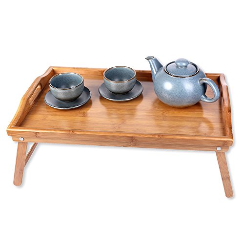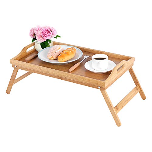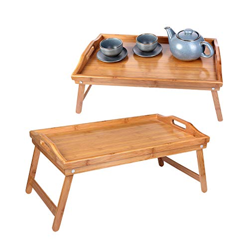KKTONER Bambu sängbricka bord med vikbara ben vikbar servering bärbar datorbricka mellanmålsbricka frukostbricka sängbord ritbord (50)