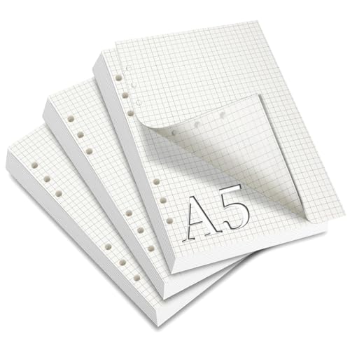 SWTYExt 3-Pack A5-Påfyllningspapper - Rutigt, Påfyllningsbart Anteckningspapper, 180 Ark, 6 Hål för Ringpärm - Refill till Anteckningsbok, Skiss, Dagbok, Målning