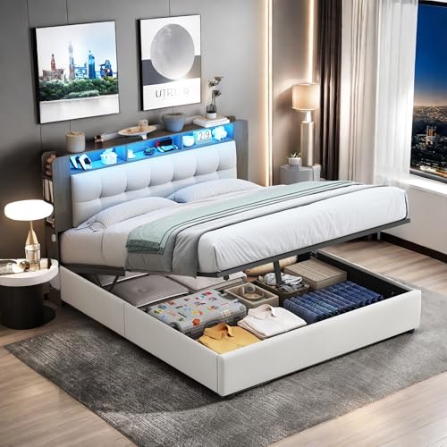 KEFSR 160 x 200 cm beige modern flytande visuell sängram med hydraulisk förvaring, PU stoppad säng med LED-lampor, minimalistisk sängram utan sänggavel