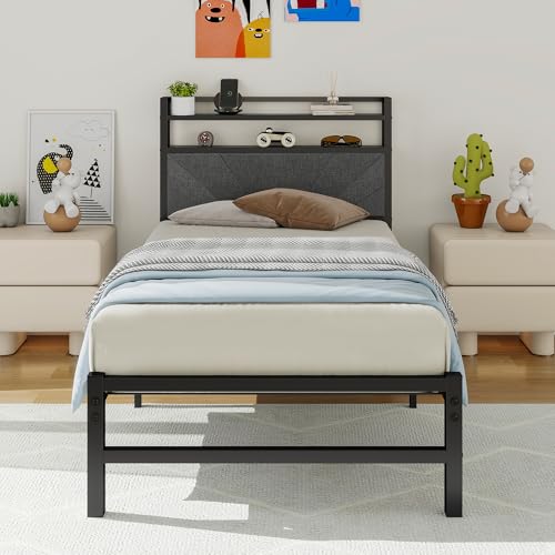 ARFARLY Sängram, enkelsäng, 90 x 200, metallsäng, ungdomssäng, tygsäng – högkvalitativ sängram med ribbotten, sänggavel för vilsam sömn – robust säng 90 x 200, modern design i mörkgrå