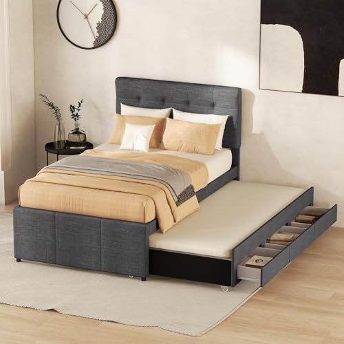 Sängklädsel, 140 x 200 cm med 90 x 190 cm utdragbar säng och 3 lådor, linnetyg, dubbelsäng med sänggavel och spjälsäng, vadderad sängram, ungdomssäng, gästsäng (beige, 140 × 200 cm)