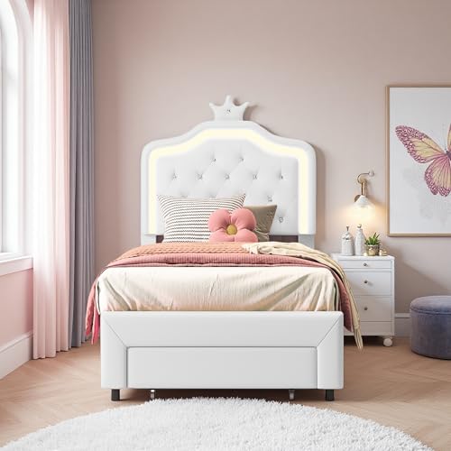 Aneutr Barnsäng på 90 x 200 cm, klädd enkelsäng med krona för flickor, prinsessäng med höjdjusterbar LED-sänggavel och ribbotten, ungdomssäng, flicksäng för barn, av PU