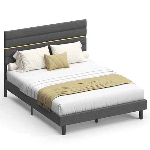 VASAGLE stoppad säng, Sängstomme, Dubbelsängsstomme, Passar 160 x 200 cm madrass, Justerbar vadderad sänggavel, Sängstomme, Metall, Massivt trä, Modernt, Skiffergrå RMB505G01