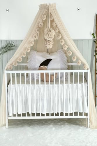 Baby Fancyroom Hussäng/himmelsäng, beige sänghimmel, dekorationsset för barnrum, barnsäng, baldakin, pompom-girlang av premiumtyll för hemmasängar, anpassbar (beige utan fjärilar, 340 cm)