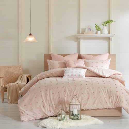 Urban Habitat Brooklyn påslakanset 100% bomull Jacquard, tofsar accent, broderade kastkuddar, shabby chic hela säsongen Comfoter överdrag, matchande örngott, sängkjol, hel/drottning, rosa 7 delar