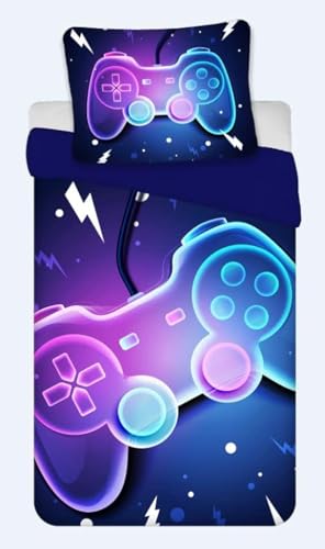 Gamer sängkläder 140x200 cm - Blått vändbart påslakanset med controller - 100% mjukt bomullssänglinne