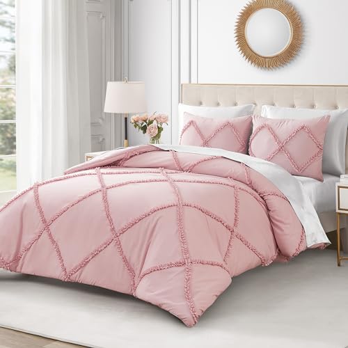 HARBOREST Queen täcke set – rosa volang täcke för dubbelsäng säng, fluffigt täckeset, 3 delar shabby chic sängkläder med 1 täcke och 2 örngott