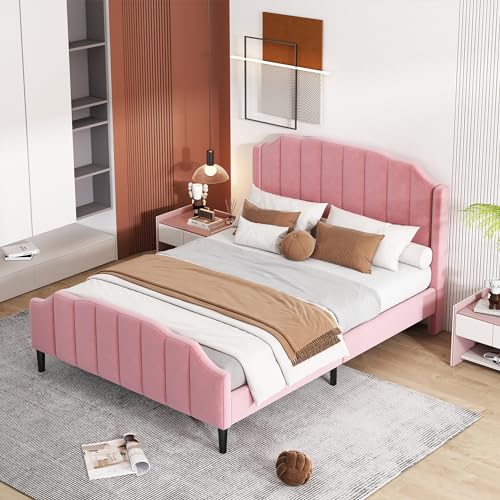 Aunvla Sängklädsel, 140 x 200 cm, sängram med sänggavel, fotdel och ribbotten, rosa, sammet, vadderad dubbelsäng, ungdomssäng, gästsäng