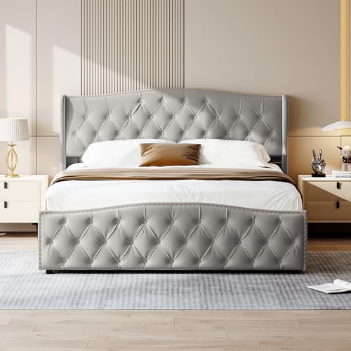 BXEYXE Sängklädsel, 160 x 200 cm, utan madrass, stoppad säng med 4 lådor, stoppad säng med ljuslist med och stereo, sammet, beige