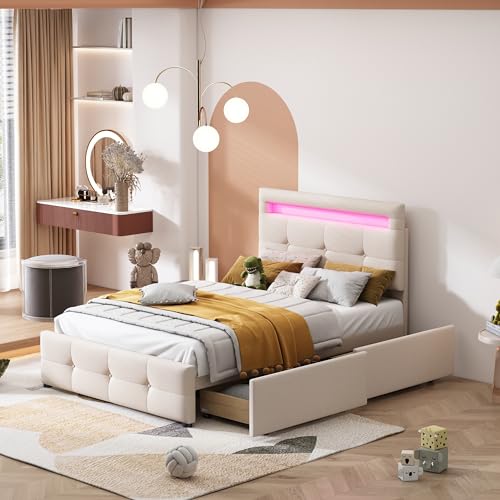 Aunvla Sängklädsel, 90 x 200 cm med LED-lampor, 2 lådor, hudvänlig linnetävling, platt enkelsäng, barnsäng, ungdomssäng, gästsäng (beige)