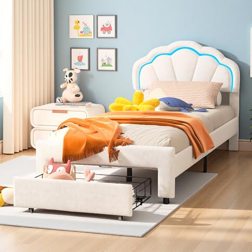 Aneutr Sängklädsel, barnsäng med LED-belysning och lådor, ungdomssäng, prinsesssäng, sammet, utan madrass (vit, 90 x 200)