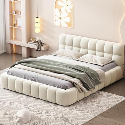 Sängklädsel, Bubble säng 140 x 200, dubbelsäng med sänglåda, stoppad säng 140 x 200 med förvaringsutrymme, ungdomssäng, flatsäng, gästsäng med ribbotten och sänggavel, linne, utan madrass (beige, 140