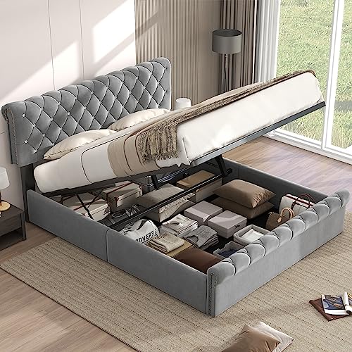 ZYLOYAL10 Sängklädsel, hydraulisk förvaringssäng med riktningsberoende lampa och USB-laddning, bred och skumfylld sänggavel, schackbrädemönster, sammet (180 x 200 cm, grå)